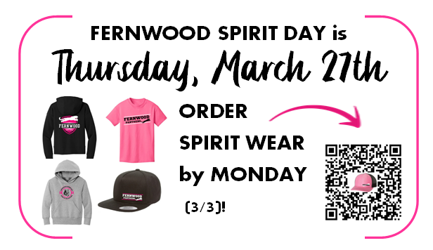 | 3/27 | SPIRIT DAY- All students Wear Fernwood shirts, black or pink | ||