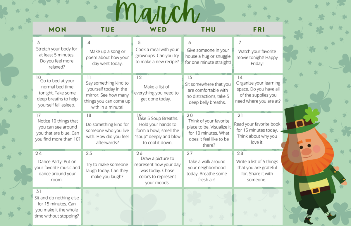 Click on the link above or the image below to access 10 months of daily self-care ideas designed to help elementary students create habits to make self-care practices a daily routine.