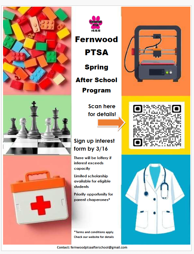 After School Enrichment Classes Spring after school classes are here! I brought back the very popular LEGO and chess classes this spring as well as a new class cooperated with North Creek High School. Due to the recent challenges in finding parent chaperones, I changed the process to encourage more parents to step up chaperoning the class. Please find the schedule below and scan the QR code for details. Please contact fernwoodptsaafterschool@gmail.com for any questions.